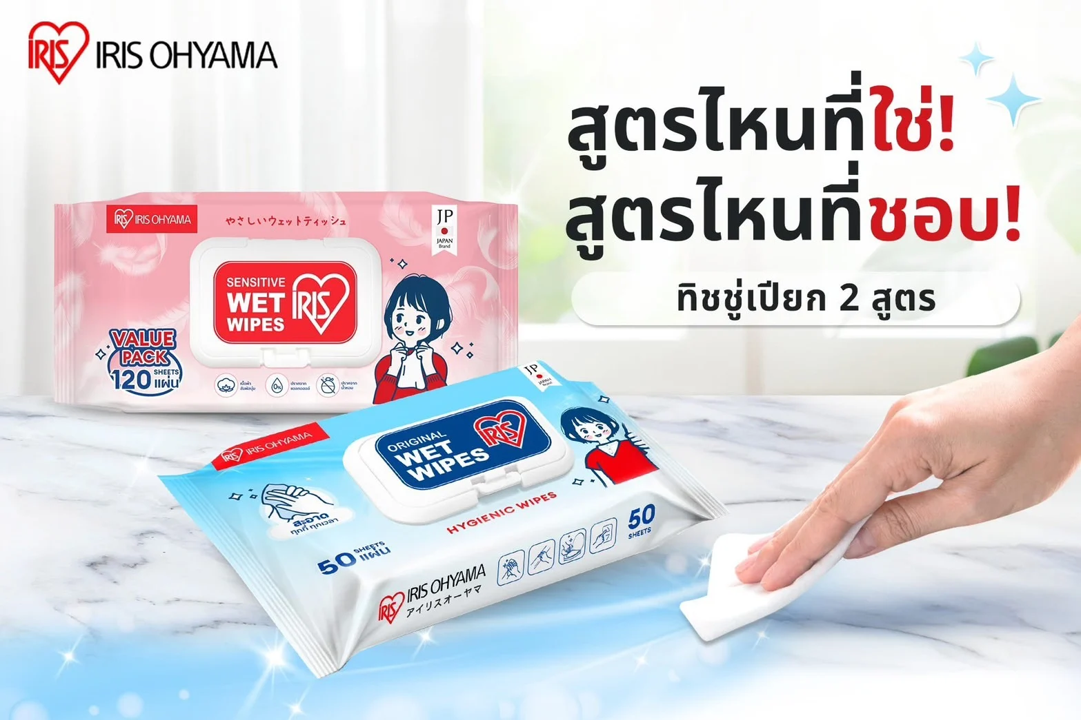 แบบที่ 1 IRIS OHYAMA Sensitive Wet Wipes (ไอริส โอยามะ เซนซิทีฟ เวท ไวพ์) สูตรอ่อนโยน (สีชมพู) อ่อนโยน ไม่ระคายเคือง สำหรับเด็กและทุกวัย มี 3 ขนาด ขนาด 20 แผ่น ราคา 28 บาท, ขนาด 80 แผ่น ราคา 99 บาท, ขนาด 120 แผ่น ราคา 129 บาท และ ขนาดใหม่ 120 แผ่น ราคา 129 บาท