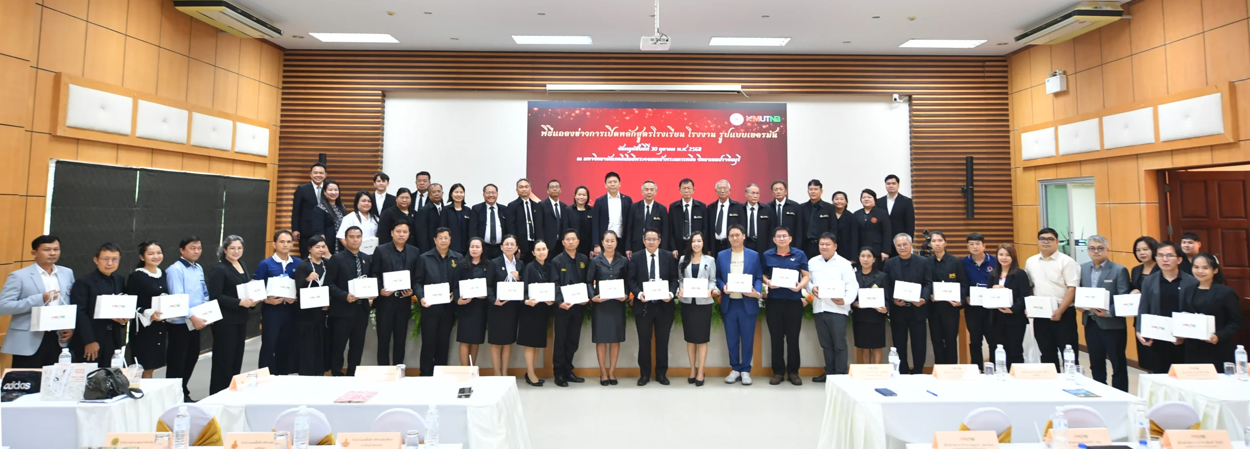 ศ.ดร.ธีรวุฒิ บุณยโสภณ นายกสภามหาวิทยาลัยเทคโนโลยีพระจอมเกล้าพระนครเหนือ (มจพ.) ศ.ดร.ธานินทร์ ศิลป์จารุ อธิการบดี พร้อมด้วย ผศ.พีระศักดิ์ เสรีกุล รองอธิการบดีประจำวิทยาเขตปราจีนบุรี อาจารย์ประจำภาควิชากล่าวความเป็นมาของหลักสูตร “โรงเรียน–โรงงาน” รูปแบบเยอรมัน หลักสูตรอนุปริญญา 4 สาขา ได้แก่ ไฟฟ้าและอิเล็กทรอนิกส์ (TIEE), เครื่องกลสมัยใหม่ (TIMM), โลจิสติกส์และดิจิทัล (TILM) และสมุนไพรและความงาม (TIHB) วางรากบนแนวคิดแบบทวิภาคี (Dual System) ของเยอรมนี ผสานการเรียนรู้ผ่านการปฏิบัติจริง (Work-Based Learning) โครงงาน และสหกิจศึกษา ตลอดเส้นทาง 5 ปี (3+2) โดยรับสมัครนักเรียนที่กำลังสำเร็จการศึกษาชั้นมัธยมศึกษาปีที่ 3 (ม.3) เพื่อพัฒนาสู่กำลังคนทักษะสูงในกลุ่ม First S-Curve และ New S-Curve ของประเทศ อย่างเป็นระบบตั้งแต่ปีต้นของการศึกษา ในวันที่ 30 ตุลาคม 2568 ณ ห้องประชุม โรงแรมวิลลาวิชาลัย มจพ. ปราจีนบุรี