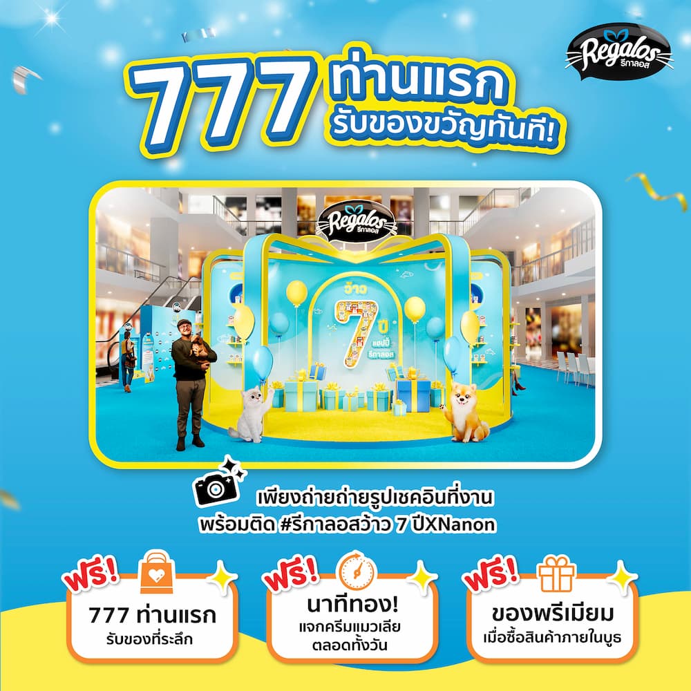 มาเติมความสุขไปพร้อมกันกับ “นนน–กรภัทร์” และน้องนูน่า ในงาน “ว้าว 7 ปี แฮปปี้ Regalos” วันอังคารที่ 9 ธันวาคม 2568 เวลา 17.00 – 19.00 น. ณ สามย่านมิตรทาวน์ (ชั้น G) พบกับไฮไลท์พิเศษ ว้าวทั้งวัน ตลอดงาน! • ร่วมแชร์ทริคดีๆ กับอินฟลูเอนเซอร์ดัง MOJIROSTYLE เวลา 13.30–14.30 น. และ MALITHESAMOYED เวลา 14.40–15.40 น. • 777 คนแรก รับของขวัญทันที! แค่ถ่ายรูปเช็คอินในงาน พร้อมติดแฮชแท็ก #รีกาลอสว้าว7ปีXNanon • นาทีทอง! แจกครีมแมวเลียตลอดวัน ใครไวกว่า ได้ก่อน ไม่ต้องลุ้นนาน! • พร้อมยกทัพจัดเต็มโปรโมชั่นพิเศษและของพรีเมียมอีกมากมาย เมื่อซื้อสินค้าภายในงาน
