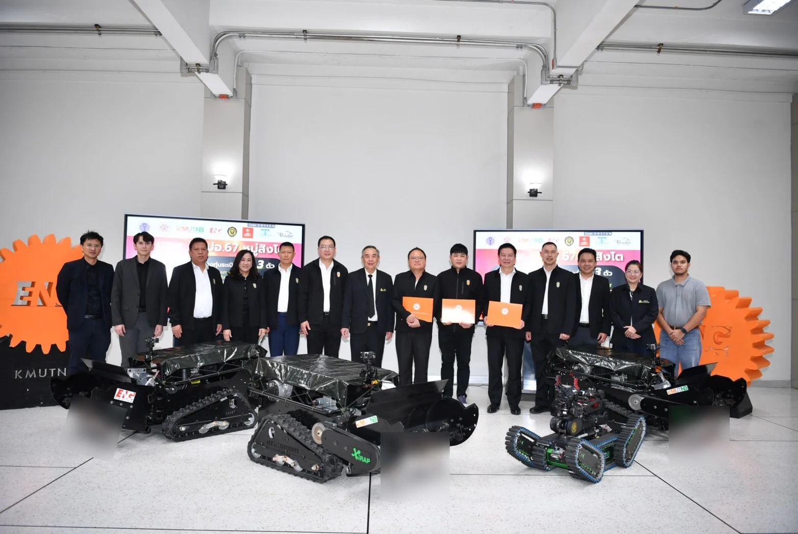 ทีมหุ่นยนต์กู้ภัย iRAP Robot มจพ. คณะวิศวกรรมศาสตร์ เจ้าของสถิติแชมป์โลกการแข่งขันหุ่นยนต์กู้ภัย 10 สมัย ซึ่งเป็นกำลังหลักของประเทศด้านการวิจัยและพัฒนาหุ่นยนต์กู้ภัยขั้นสูง โดยทีมได้ผสานเทคโนโลยีปัญญาประดิษฐ์ ระบบเซนเซอร์อัจฉริยะ และกลไกควบคุมความแม่นยำสูงเข้าด้วยกัน เพื่อให้หุ่นยนต์สามารถปฏิบัติงานด้านการค้นหาและกวาดล้างทุ่นระเบิดได้อย่างมีประสิทธิภาพ ลดการเผชิญความเสี่ยงของเจ้าหน้าที่ในแนวปฏิบัติการโดยตรง ภายใต้การนำของ รองศาสตราจารย์ ดร.กิตติชัย ธนทรัพย์สิน (วปอ.67) คณบดีคณะวิศวกรรมศาสตร์ มจพ. พร้อมด้วยคณาจารย์ ผศ.นพดล พัดชื่น ผศ.ดร.อรัญ แบล็ทเลอร์ และอาจารย์ เนตินันท์ กุตนันท์ รวมถึงทีมนักศึกษาและบุคลากร ซึ่งได้รับการสนับสนุนงบประมาณจาก บริษัท ที.ดี.ซี สตีลกรุ๊ป จำกัด บริษัท ตั้งธนสิน จำกัด (โรงรับจำนำ อีซี่มันนี่) บริษัท เดอะ พาราดิโซ เจเค ดีไซน์ โฮเทล จำกัด วปอ.67 และ วปอ.67 หมู่สิงโต ณ อาคาร 81 เมื่อวันที่ 16 ธันวาคม 2568